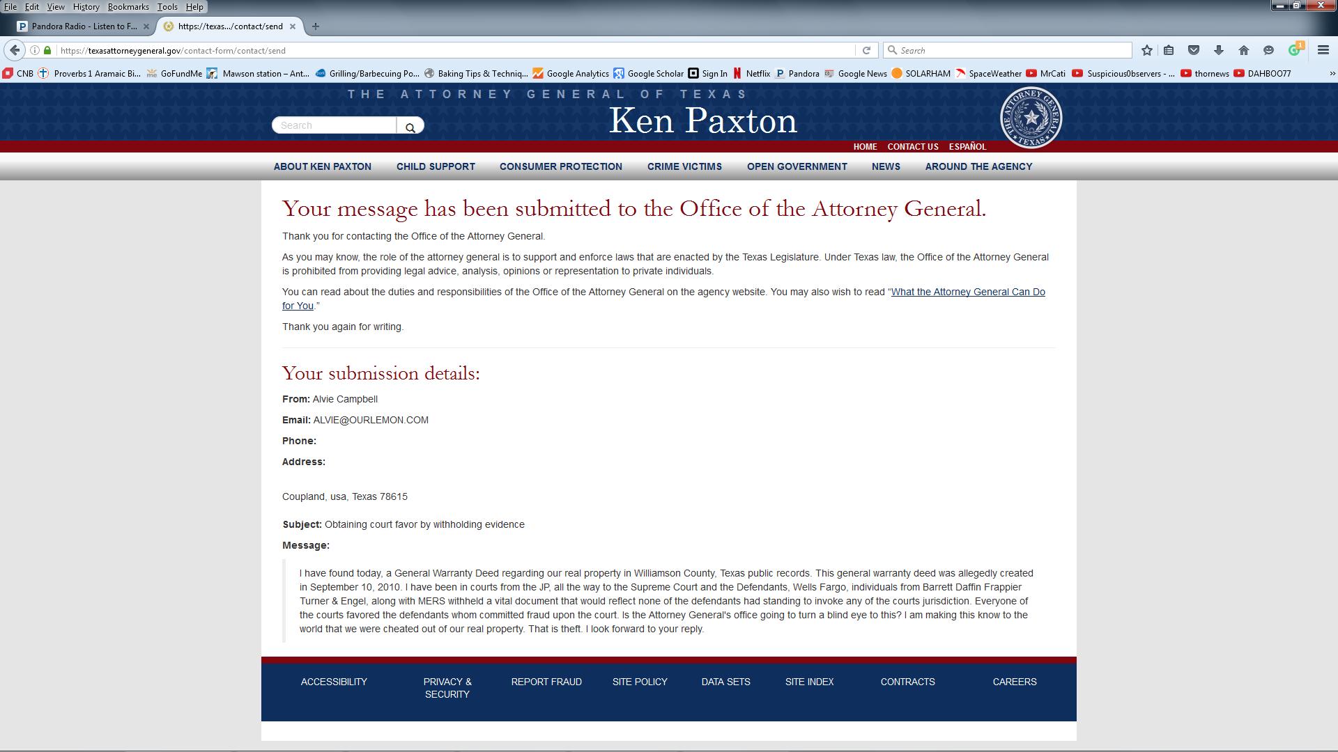 In the meantime, I have notified the Texas Attorney General, and the U.S. Attorney General to report this. Here is the one to Texas... I have also brought this "general warranty deed" to the attention of the Williamson County clerk.