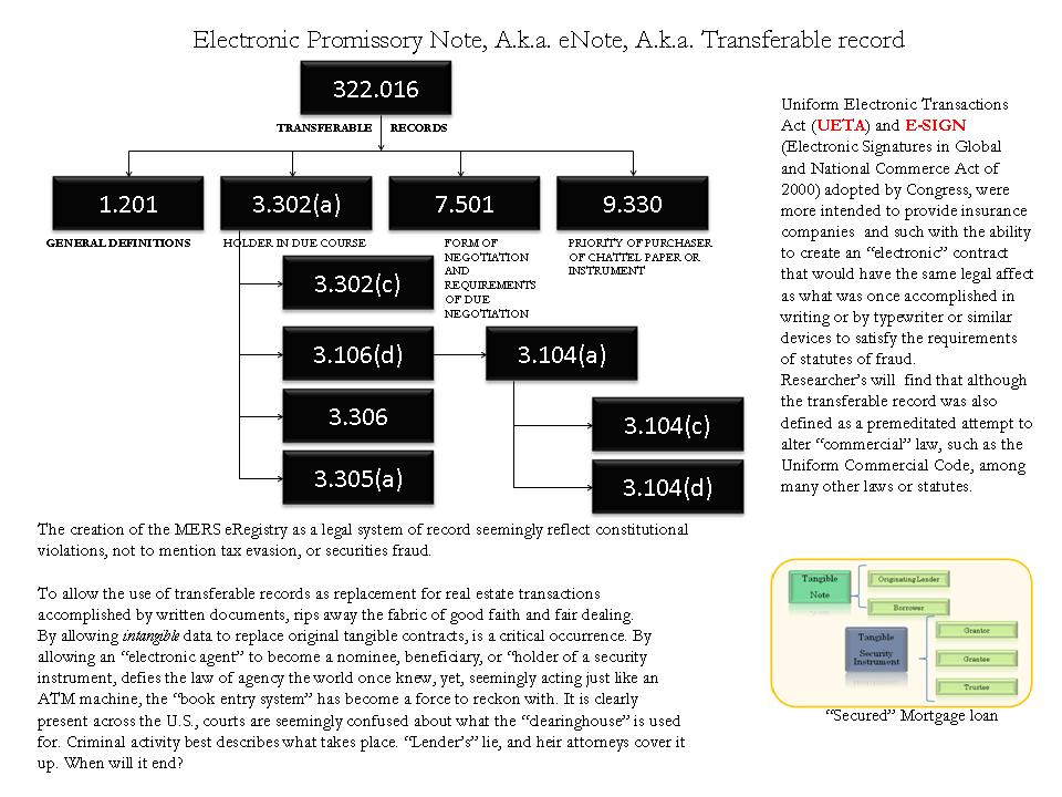 The following slides are a breakdown of the Uniform Electronic Transaction Acts, as published by Texas Legislators. It is ironic that this electronic transfer stuff originally was intended as an ideal way for insurance companies to utilize electronic contracts, and those contracts could be enforced by law. Some how, a lot of folks were mislead to believe it was a law for MERS members to legally conduct real estate transactions electronically? MERS members probably could have accomplished this process, but they took shortcuts, and bypassed vital laws to keep the real property mortgages "secured", thus rendering them unsecured. A debacle for all.